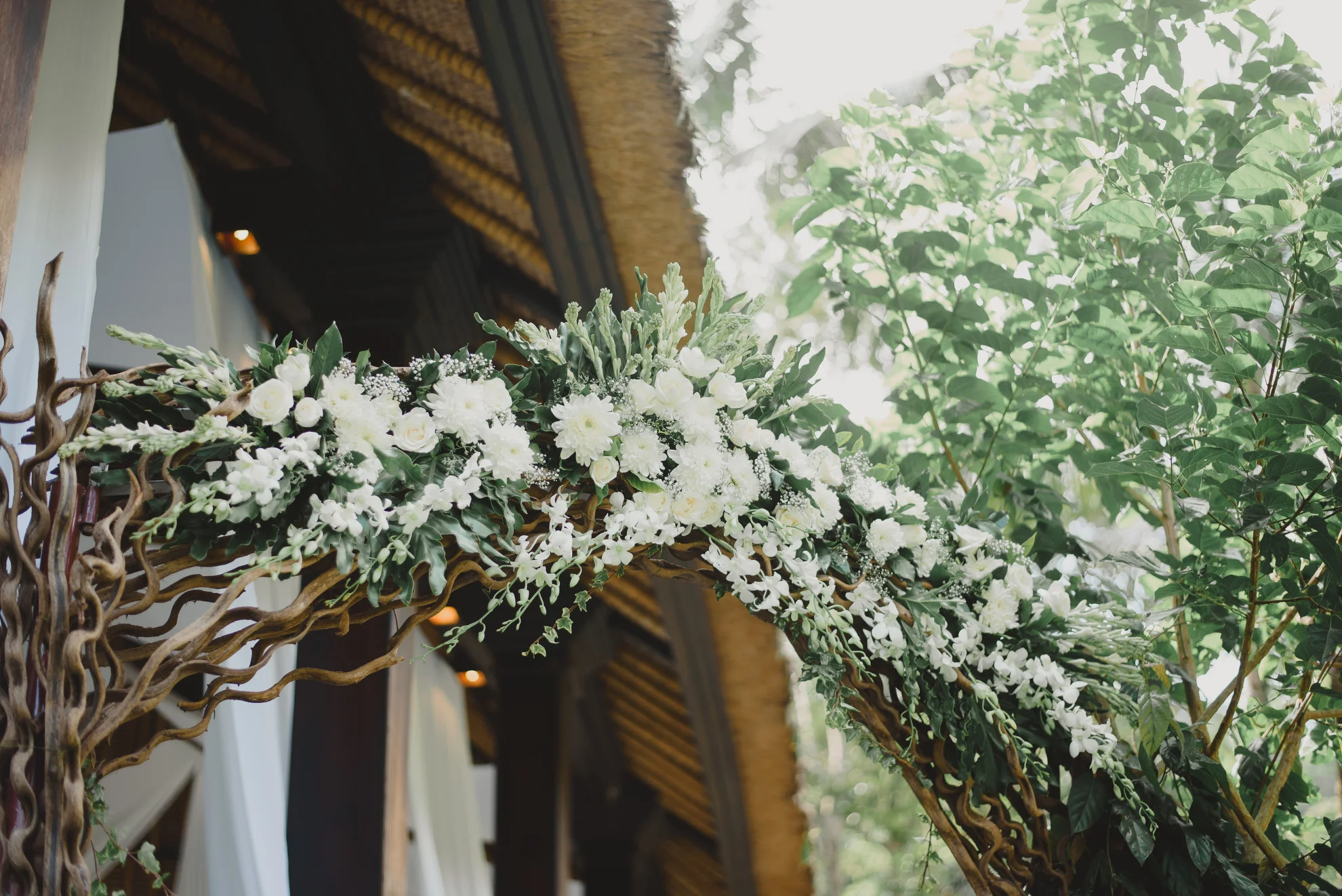 As dusk falls you’ll make a grand entrance through the massive, intricately carved stone gates of the Royal Temple Courtyard. Here you’ll celebrate with your loved ones under the frangipani trees amidst the Royal Pita Maha’s lush gardens. The trees above are adorned with fairy lights and glowing cream silk lanterns. But the sense of magic is completed by 100 palm-frond candles and flaming bamboo torches which create an unforgettable jungle vibe.